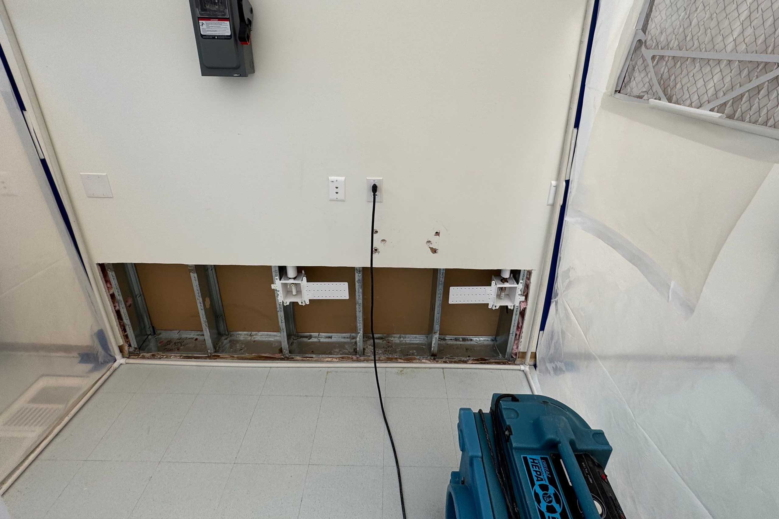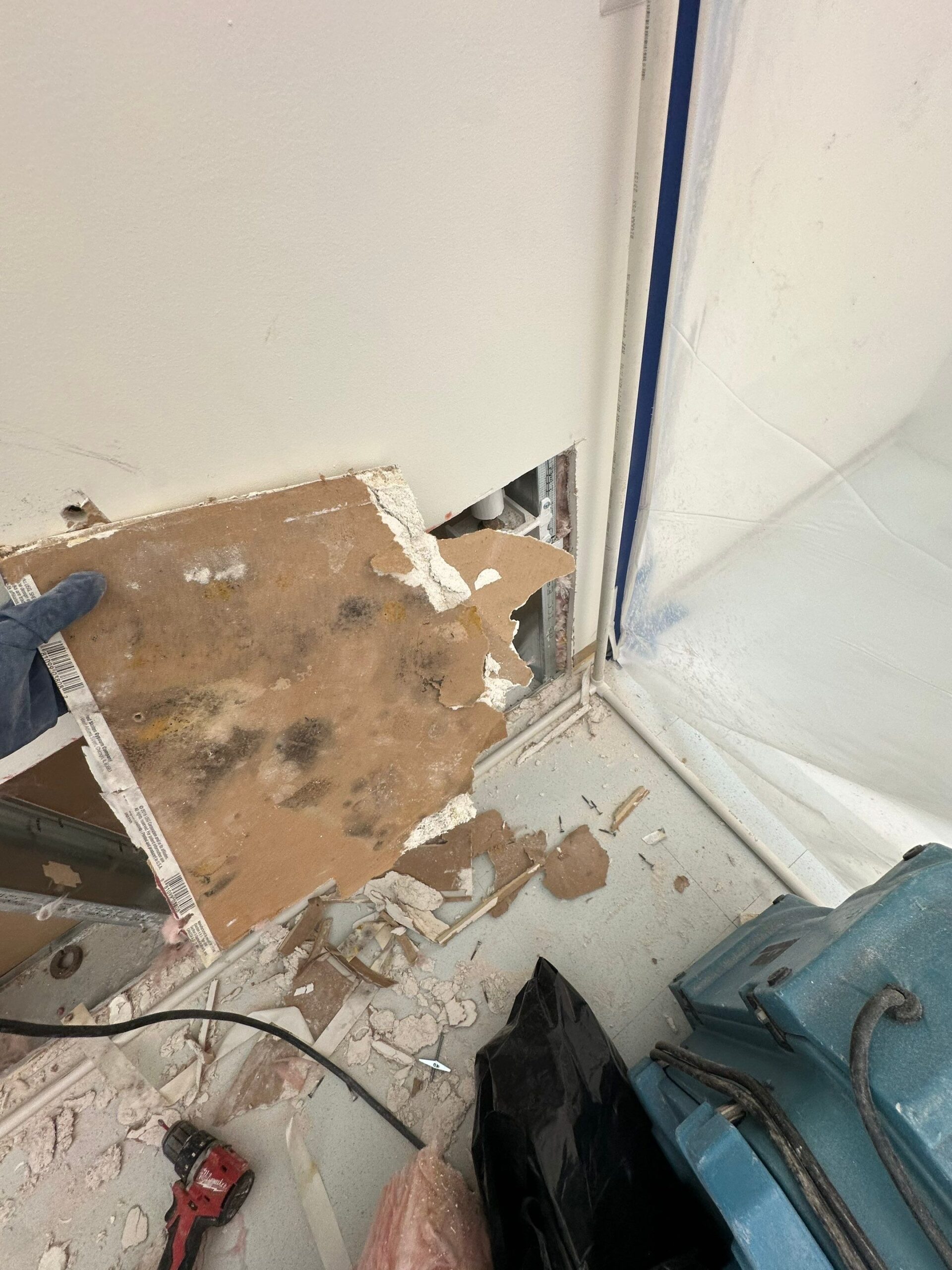 A Clear Developments tenant in Westminster, Colorado (Denver metro, US-36 corridor near Standley Lake/Bradburn Village business parks) reported odor and staining along a wet wall. Opening the cavity confirmed chronic moisture at plumbing penetrations with backside drywall colonization. Operations had to continue in adjacent benches. Our approach was containment-led from minute one.