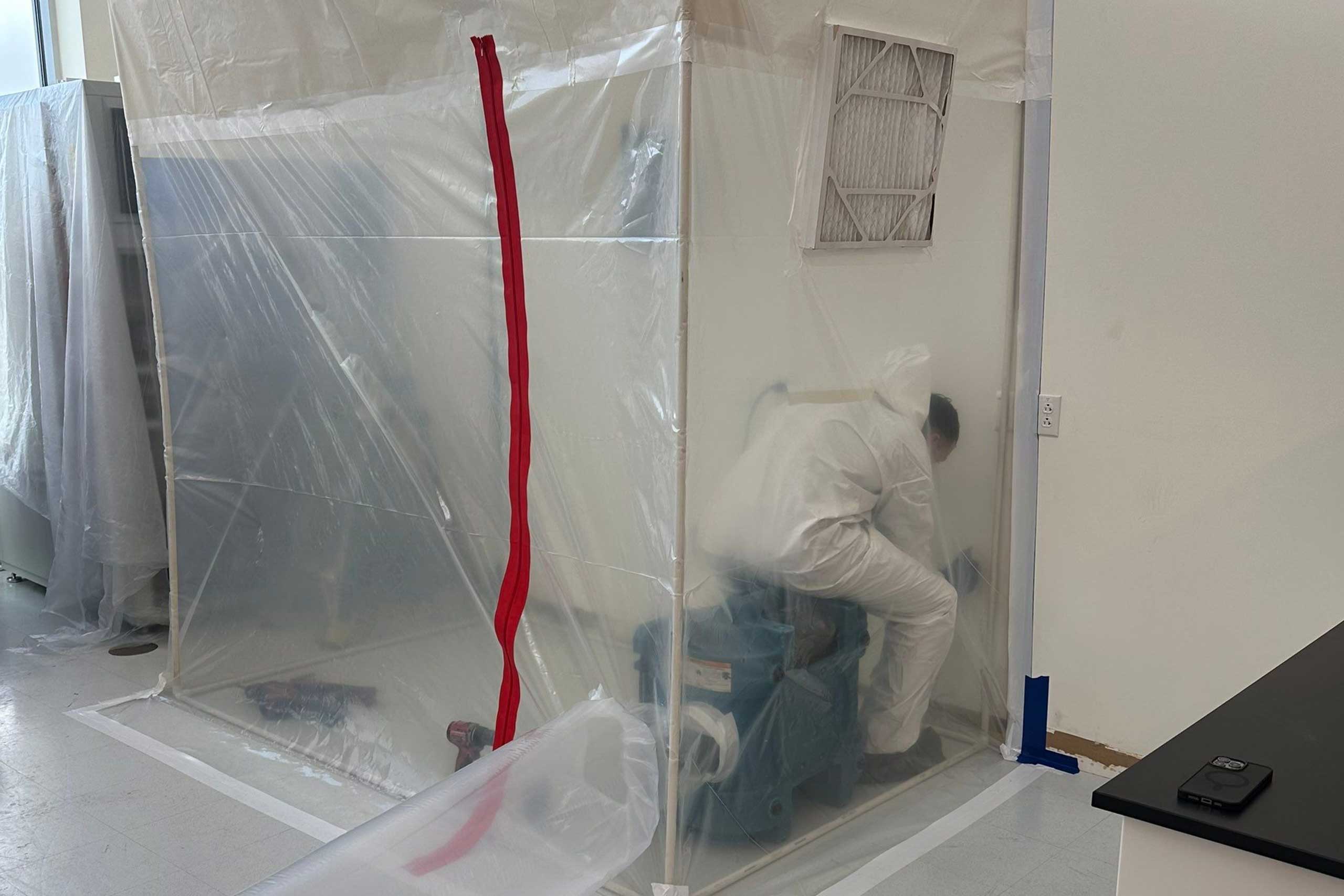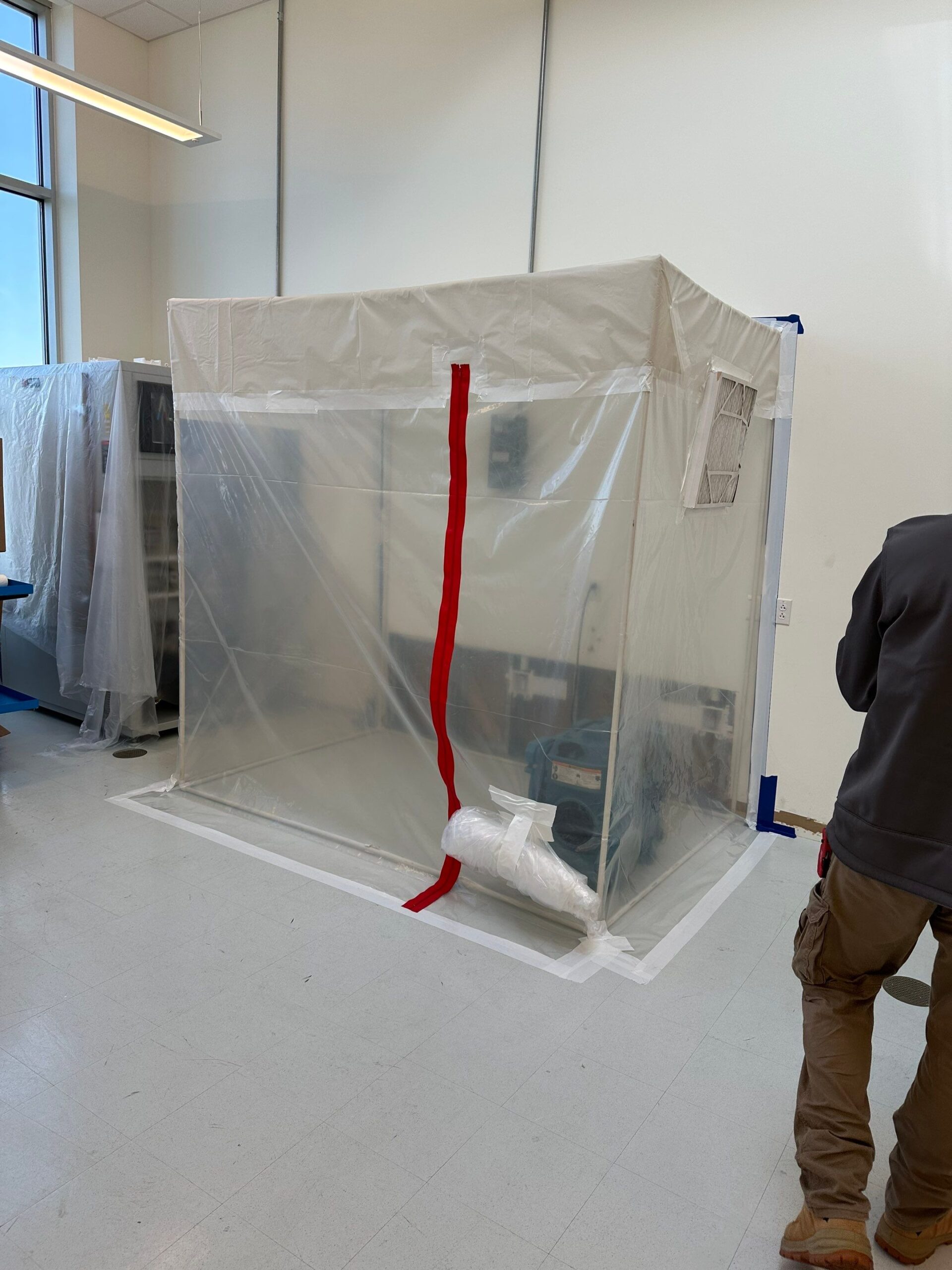 • Soft-wall chamber, 6-mil poly, zipper access, slab-to-ceiling seals, make-up air panel, and viewing window for QC.
