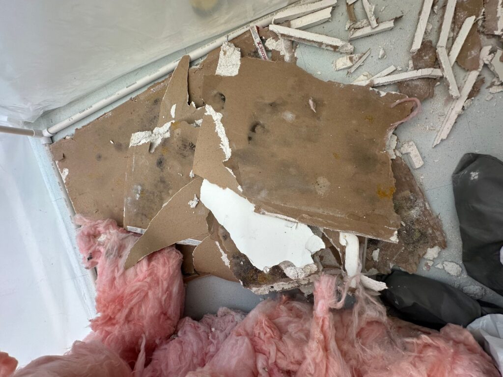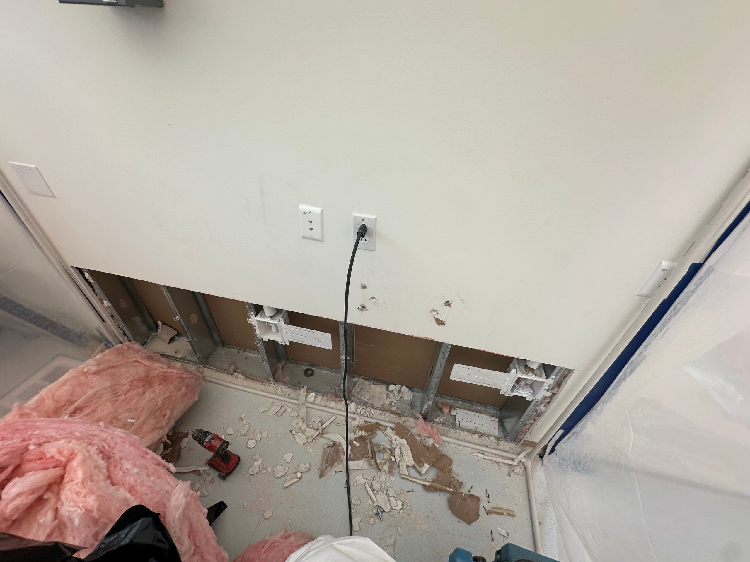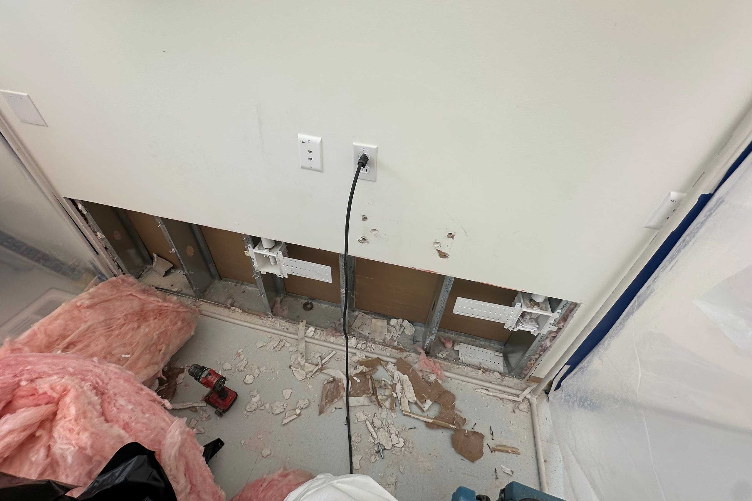 • Drywall and insulation removed and bagged within the containment; penetrations exposed for source correction.